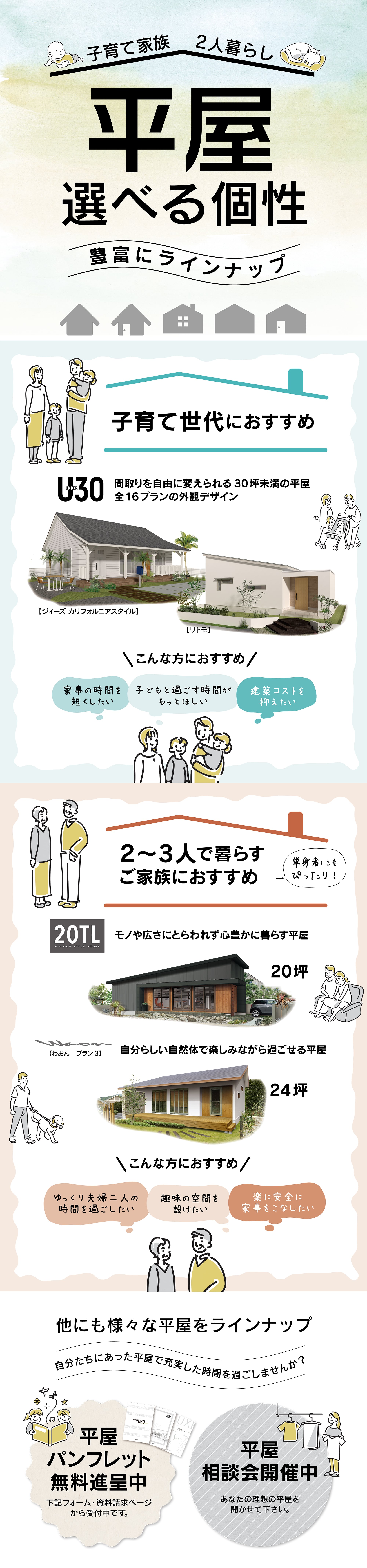 ギャブハウスではお客様の暮らし方に合わせた平屋を、個性豊かにラインナップ。子育て世代のご家族も、2〜3人で暮らすご家族にもぴったりのプランを多数ご用意しております。自分たちにあった住まいで充実した時間を過ごしませんか?こだわりの家づくりをお考えの方、ご興味のある方、まずはお気軽にお問い合わせ下さい。建てたい平屋のプランニングと資金計画を無料で致します。